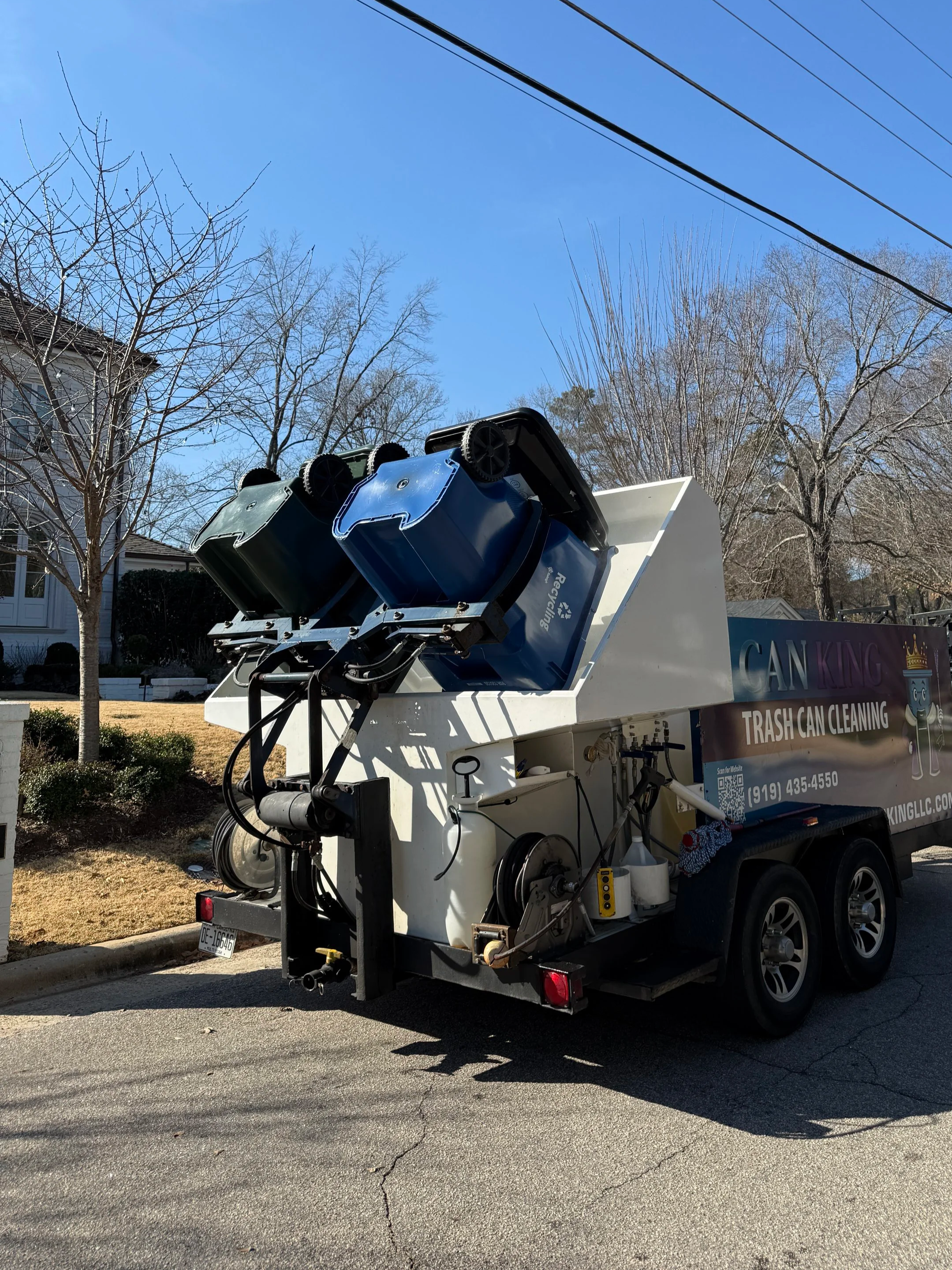 We use a specialized trailer designed specifically for cleaning trash cans. Our system uses 200 degree high-pressure water to clean, sanitize, and deodorize your cans, leaving them fresh, spotless, and smelling great.